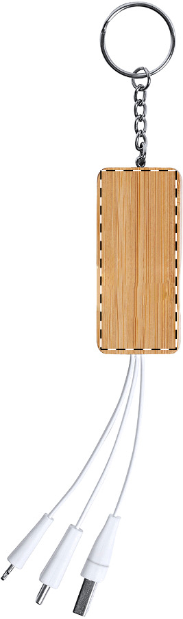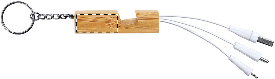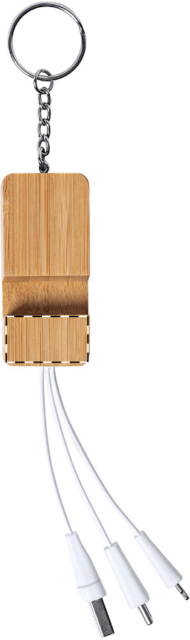 Handyhalter-Schlüsselanhänger aus Bambus mit USB-Ladekabel mit Mikro-USB-, USB-C und Lightning-Stecker und USB-/USB-C-Buchsen.